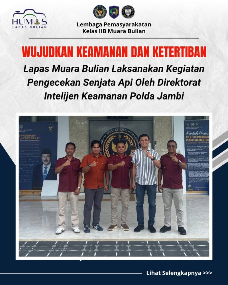 “Kami berterima kasih kepada Tim Ditintelkam Polda Jambi atas sinergi dan perhatian dalam memastikan keamanan serta legalitas penggunaan senjata api di lingkungan Lapas. Kegiatan ini menjadi bagian penting dalam menjaga profesionalisme dan ketertiban pelaksanaan tugas pengamanan,” ujarnya.