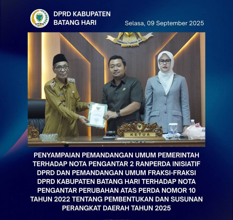 Batang Hari-Matajurnalis.co.id (15/09/2025) – Dewan Perwakilan Rakyat Daerah (DPRD) Kabupaten Batang Hari menggelar Rapat Paripurna dalam rangka Penyampaian Pemandangan Umum Pemerintah terhadap Nota Pengantar 2 Ranperda Inisiatif DPRD serta Pemandangan Umum Fraksi-Fraksi DPRD Kabupaten Batang Hari terhadap Nota Pengantar Perubahan atas Perda Nomor 10 Tahun 2022 tentang Pembentukan dan Susunan Perangkat Daerah Tahun 2025.