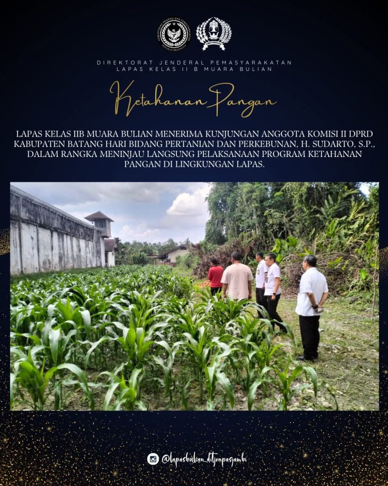Muara Bulian –Matajurnalis.co.id tgl 24/12/25 Lembaga Pemasyarakatan (Lapas) Kelas IIB Muara Bulian menerima kunjungan Anggota Komisi II DPRD Kabupaten Batang Hari Bidang Pertanian dan Perkebunan, H. Sudarto, S.P., dalam rangka meninjau langsung pelaksanaan program ketahanan pangan di lingkungan Lapas Muara Bulian.