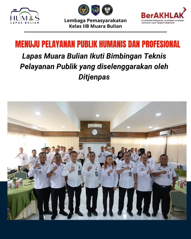 Muara Bulian, 30 Oktober 2025 – Lembaga Pemasyarakatan (Lapas) Kelas IIB Muara Bulian menjadi tuan rumah pelaksanaan Bimbingan Teknis (Bimtek) Pelayanan Publik Pemasyarakatan yang diselenggarakan oleh Direktorat Jenderal Pemasyarakatan (Ditjenpas). Kegiatan ini diikuti oleh perwakilan dari seluruh Unit Pelaksana Teknis (UPT) Pemasyarakatan se-wilayah Jambi.