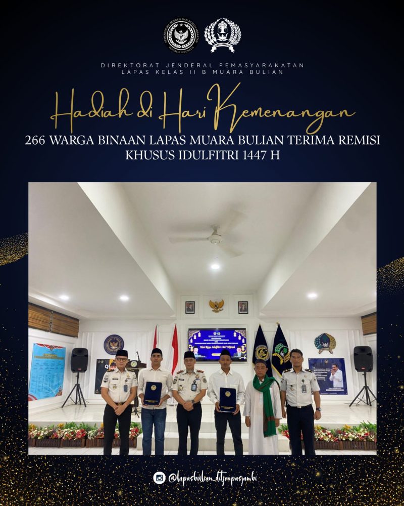 Muara Bulian –Matajurnalis.co.id Sabtu 21/03/26 Lembaga Pemasyarakatan (Lapas) Kelas IIB Muara Bulian melaksanakan penyerahan Remisi Khusus bagi narapidana dalam rangka peringatan Hari Suci Nyepi dan Hari Raya Idulfitri Tahun 2026. Kegiatan tersebut berlangsung pada Sabtu, 21 Maret 2026 pukul 10.00 WIB di Aula Lapas Kelas IIB Muara Bulian.