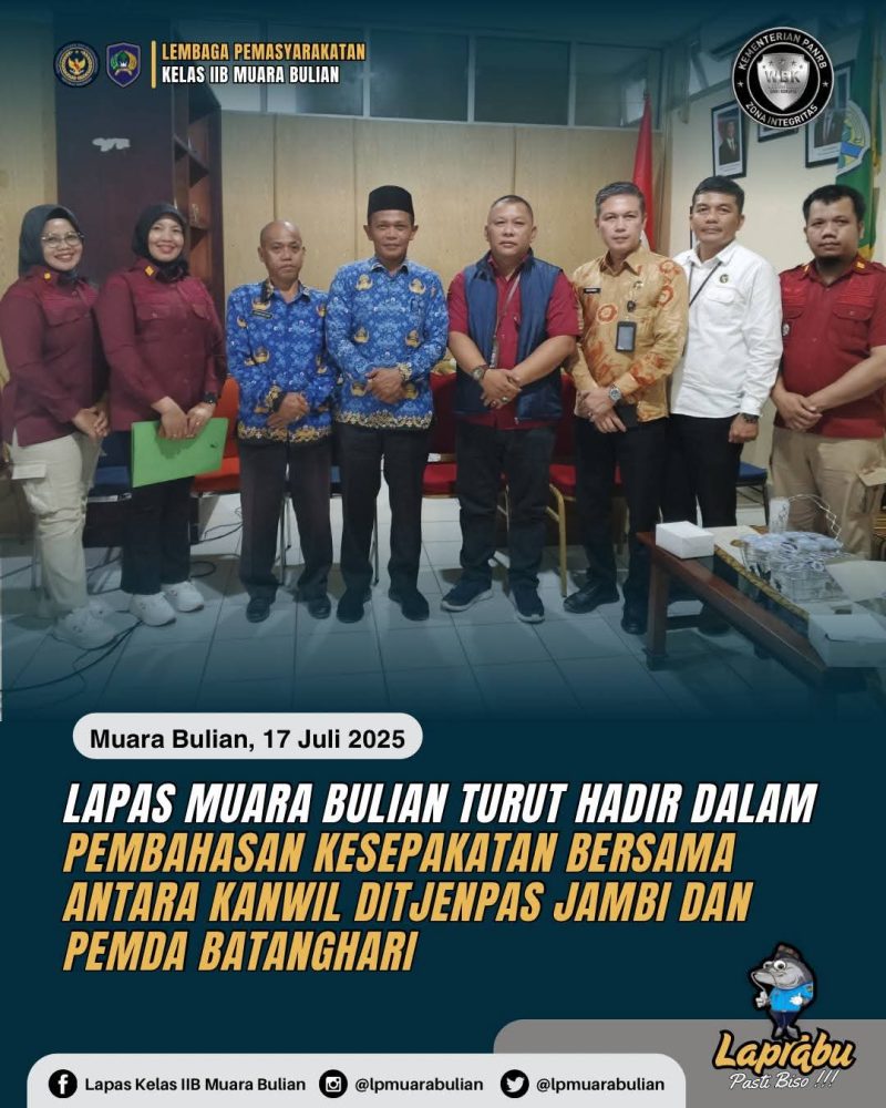 Muara Bulian-matajurnalis.co.id 17 Juli 2025 – Dalam upaya memperkuat sinergi lintas instansi, Lapas Kelas IIB Muara Bulian turut serta dalam kegiatan Pembahasan Kesepakatan Bersama yang berlangsung di Aula Kantor Bupati Batang Hari, Provinsi Jambi.