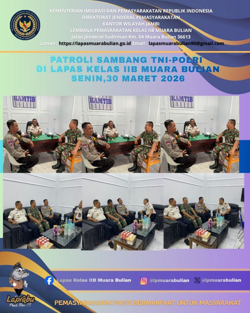 Muara Bulian-Matajurnalis.co.id Senin tgl 30 Maret 2026 – Dalam upaya menjaga stabilitas keamanan dan ketertiban pasca perayaan Hari Raya Idulfitri 1447 H, Lembaga Pemasyarakatan (Lapas) Kelas IIB Muara Bulian memperkuat sinergitas bersama aparat penegak hukum (APH) melalui kegiatan patroli sambang.